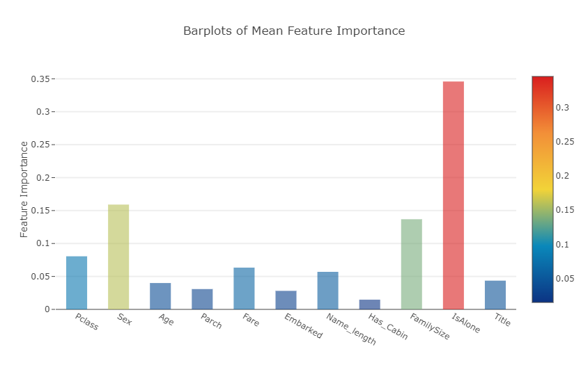 Having obtained the mean feature importance across all our classifiers, we can plot them into a Plotly bar plot as follows: