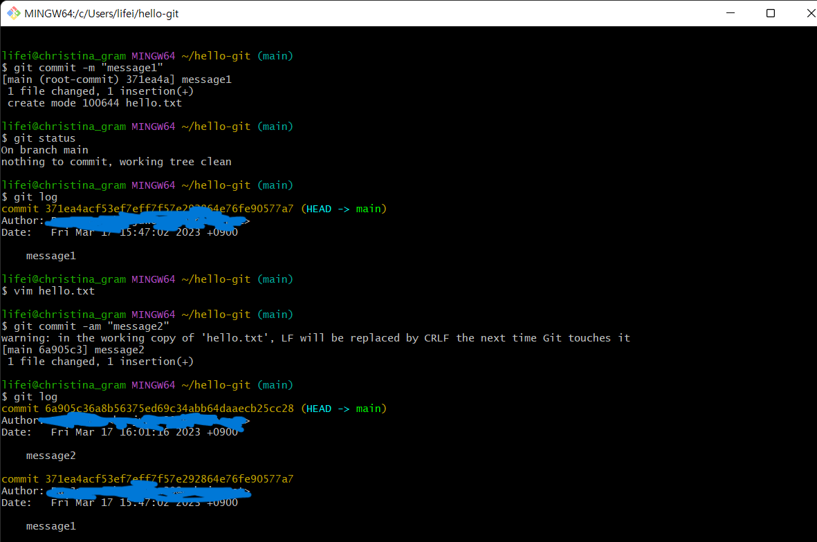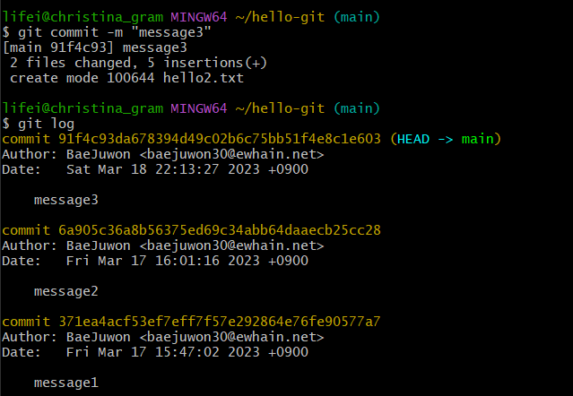 가장 최근 커밋부터 순서대로 커밋 메시지와 관련 파일 나열 >> message3 커밋은 hello.txt, hello2.txt 파일과 관련되어 있고 message2는 hello.txt 파일과 관련되어 있다는 점 확인 가능