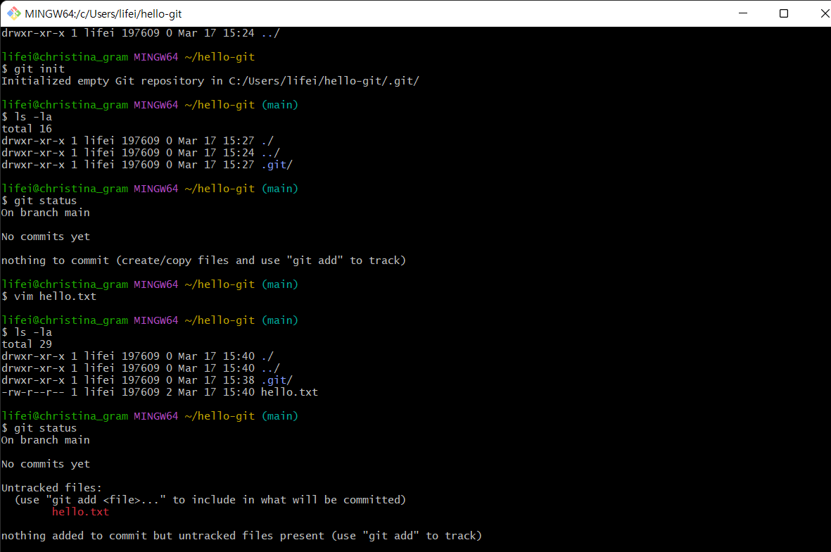 hello.txt를 git-hello에서 만든 후 다시 깃 상태 확인