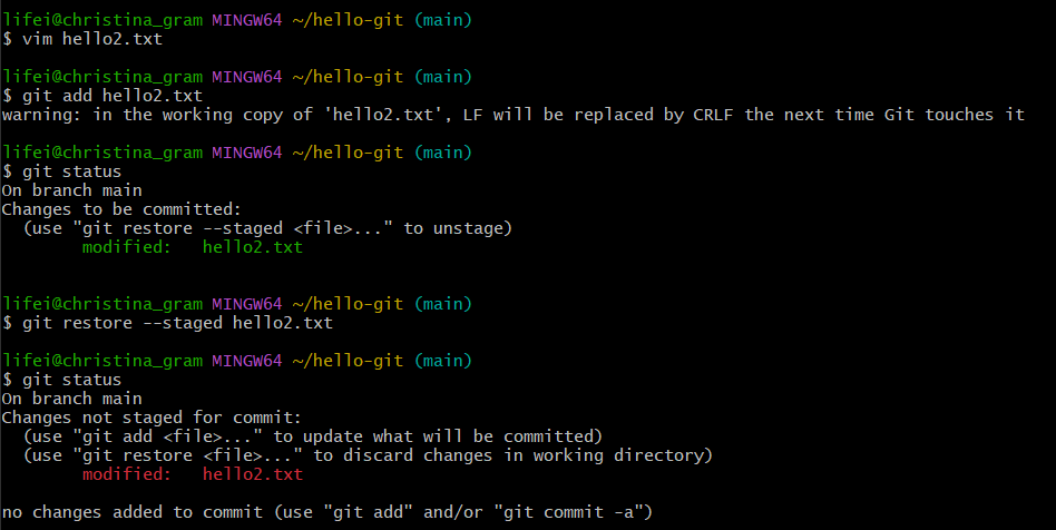 마찬가지로 stage에 올린 hello2.txt파일을 다시 내리기 위해서는 git restore --staged hello2.txt 명령 사용 ( --staged 이 옵션만 사용하면 스테이지에 있는 모든 파일을 한꺼번에 되돌릴 수 있고, 뒤에 파일 이름을 붙이면 해당 파일만 골라서 되돌림)