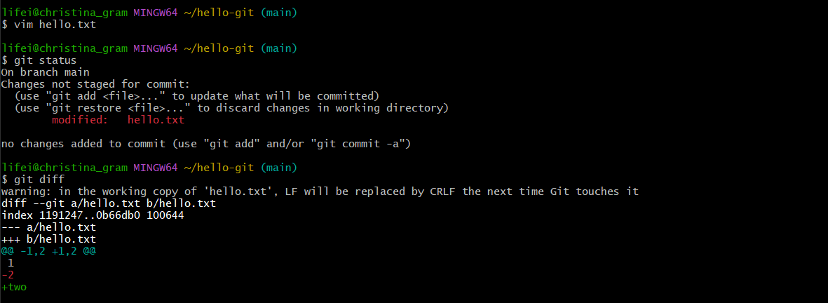 git diff 명령을 사용하면 방금 수정한 hello.txt 파일이 저장소에 있는 최신 버전의 hello.txt와 어떻게 다른지 확인 가능