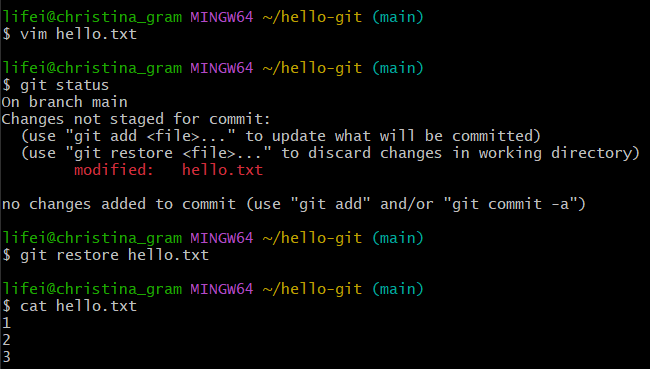 git restore 명령으로 hello.txt의 수정을 취소한 후 cat 명령을 사용해 파일 내용을 확인해 보면 실제로 수정했던 3이 다시 나타났음을 확인 가능