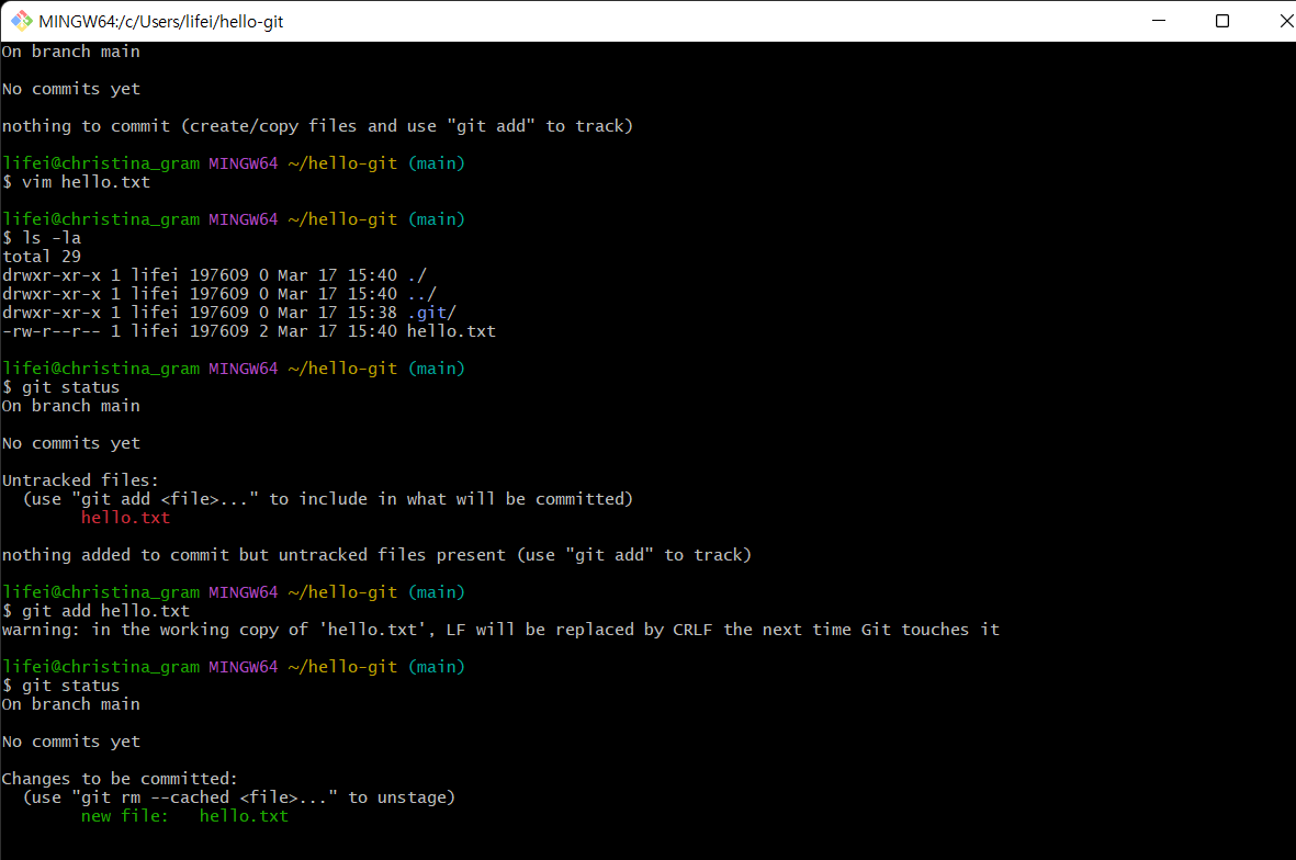 hello.txt 파일 앞에 new file:이라는 수식어 추가 >> 새 파일 hello.txt를 (앞으로) 커밋할 것이다 라는 뜻