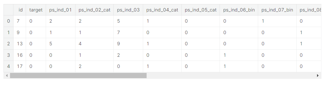 ps_ind_05_cat | ps_reg_03 | ps_car_03_cat | ps_car_05_cat | ps_car_07_cat | ps_car_09_cat | ps_car_14
