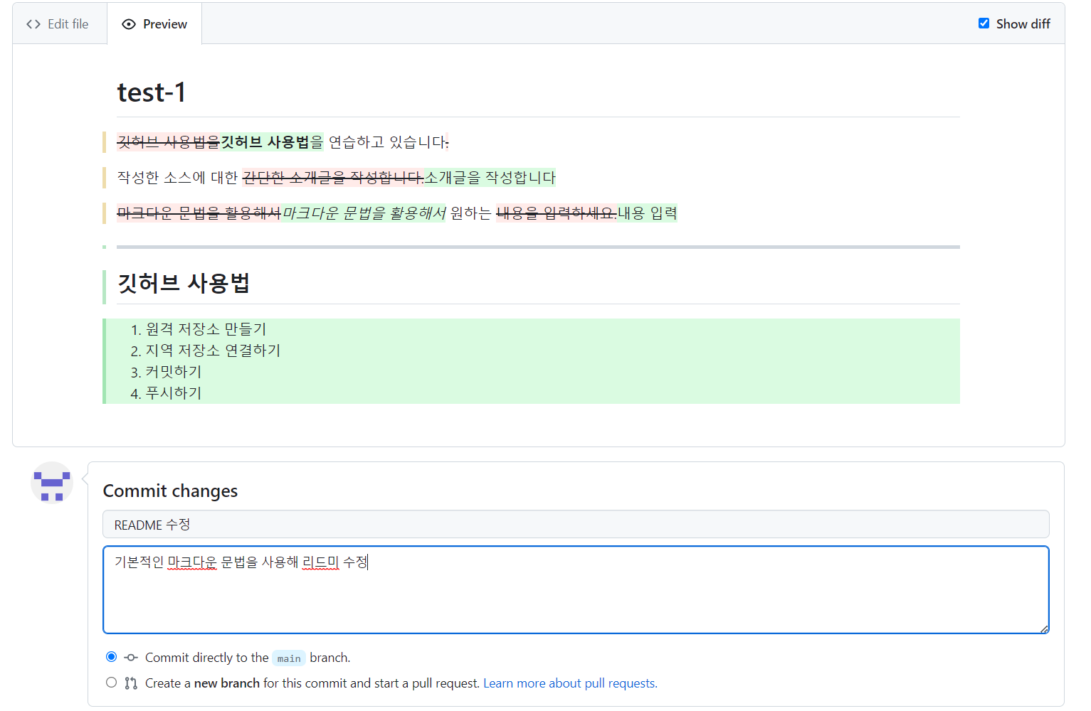 위의 마크다운 기본 문법을 사용하여 README 수정