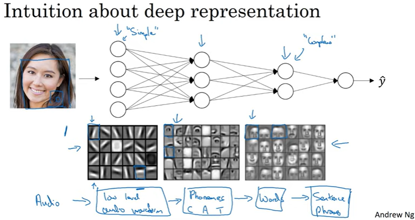 이처럼 간단한 것에서 복잡한 것으로의 계층 표현 혹은 구성 표현은 얼굴 뿐만이 아니라 다른 데이터에서도 적용됨. 예를 들어 음성 인식 시스템을 구축하는 경우 음성을 어떻게 시각화할 것인가에 관한 것인데, 음성을 입력으로 줄 때 신경망의 첫 번째 층은 낮은 단계의 음성 파형 특징을 탐지함. 낮은 단계의 파형을 구성하는 것은 소리의 기본 단위 탐지를 학습하는 과정이라고 할 수 있으며 이는 언어학적으로 '음소'라고 부름(cat의 경우 c, a, t,가 각각 음소). 소리의 기본 단위를 찾는 것을 학습하고 그것을 다같이 구성해서 음성의 단어를 인식하는 데 학습하기도 하고, 단어를 구성해서 구나 문장을 인식하기도 함. 따라서 여러 개의 은닉층을 갖는 심층 신경망은 낮은 단계에서는 간단한 특징을 학습하게 되고 그 후 깊은 층에서는 탐지된 간단한 것들을 함께 모아 단어, 구, 문장같은 더 복잡한 것들을 탐지하게 됨. 이를 통해 음성 인식을 수행할 수 있는 것. 초기의 층에서 계산되는 것은 상대적으로 간단한 함수로 보여지지만, 네트워크가 더 깊어질수록 놀라울만큼 복잡한 수행이 가능해짐. 이는 마치 사람의 뇌는 모서리같은 눈에 보이는 간단한 것부터 감지하고 이를 모아 얼굴과 같은 더 복잡한 정보를 인식하는 것과 비슷하다고 볼 수 있음.