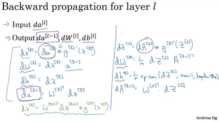 마지막 세부사항은, 정방향 반복은 입력 데이터 X로 초기화하지만 역방향 반복의 경우, da[l]은 로지스틱 회귀에서 이진분류를 할 때 -y/a+(1-y)/(1-a)와 같으므로 출력, 즉 y의 예측값에 대응되는 손실 함수의 도함수는 da의 식과 같다고 보여질 수 있음(미분적분학 공식을 이용하여 손실함수 L을 미분해보면 da의 식을 얻을 수 있음). 따라서 최종 층인 L에 대한 da를 사용해야 하는 것. 그리고 벡터화까지 적용하면 dA[1]으로 m번째 학습 데이터까지 반영함.
