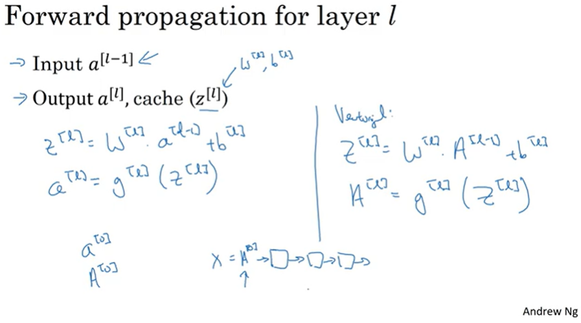 네 번째 함수를 구현하는 방법은 z[l] = W[l]*a[l-1]+b[l] 그리고 a[l]은 z[l]에 활성화 함수를 적용시킨 것과 같음. 만약 벡터화 구현을 원한다면 z[l] = W[l]*A[l]+b[l], 그리고 A[l]은 z[l]에 적용된 g[l]임. 네 번째 단계에 대한 다이어그램(정방향 박스의 체인)을 기억해보면, A[0]을 넣어서 초기화시켰음(A[0] 값은 X와 동일). 여기서 첫 번째 것에 대한 입력값 a[0]은 한 번에 하나씩 할 경우의 학습 데이터에 대한 입력 특성이고, A[0]은 전체 학습 세트를 진행할 때의 입력 특성임. 따라서 체인에서 첫 번째 정방향 함수에 대한 입력값이 되는 것. 그리고 이 과정을 반복하는 것은 왼쪽에서 오른쪽으로 가는 정방향 전파를 계산할 수 있게 함.