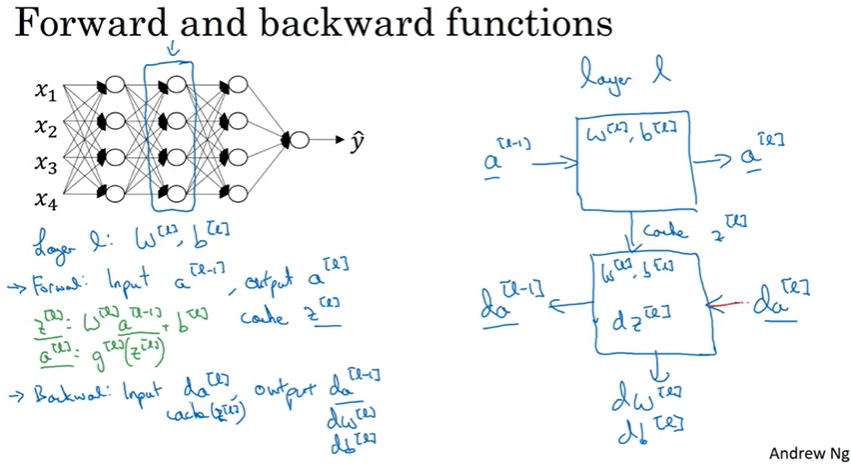 한편 역전파의 단계에서 다시 층 L에 대한 계산을 살펴보면, 함수를 구현하게 되는데 입력으로 da[l]을 받고 출력으로 da[l-1]이 나옴. 입력 da[l]에서 저장해 놓은 z[l]을 사용하며 da[l-1]과 경사 하강법 학습을 위한 그래디언트(dw[l], db[l])을 출력함. 따라서 이것이 정방향과 역방향 단계를 구현하기 위한 기본 구조가 되며 이는 정방향 함수와 역방향 함수라고도 불림.
