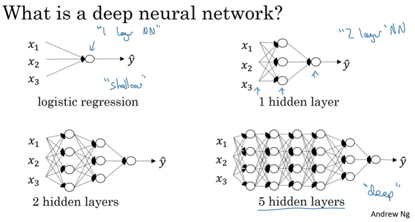 위 슬라이드에 로지스틱 회귀의 예식, 단일 은닉층을 가진 신경망의 예시, 아래에는 두 개의 은닉층과 다섯 개의 은닉층을 가진 신경망의 예시가 있음. 우리는 로지스틱 회귀를 매우 얕은 모델이라고 하는데, 반면 아래쪽 모델들은 더 깊이 있는 모델들임. 얕음과 깊음은 정도의 문제인데, 이 두 개의 층을 가진 신경망은 여전히 얕지만 로지스틱 회귀만큼은 아님. 기술적으로 로지스틱 회귀는 한 층의 신경망인데, 지난 몇 년 동안 기계 학습(ML)의 커뮤니티의 인공지능이 얕은 모델은 보통 할 수 없는 학습을 심층 신경망으로 가능하게 하는 함수가 있다는 것을 깨달았음. 어떤 주어진 문제에서 얼마나 깊은 신경망을 사용해야 하는지 미리 정확하게 예측하는 것은 어렵기 때문에, 로지스틱 회귀를 시도하고 그 다음에 두 개의 은닉층을 시도함. 은닉층의 개수가 또 다른 하이퍼파라미터가 됨. 개발 설정 과정에서 다양한 값을 시도하고 검증 데이터에서 평가함.
