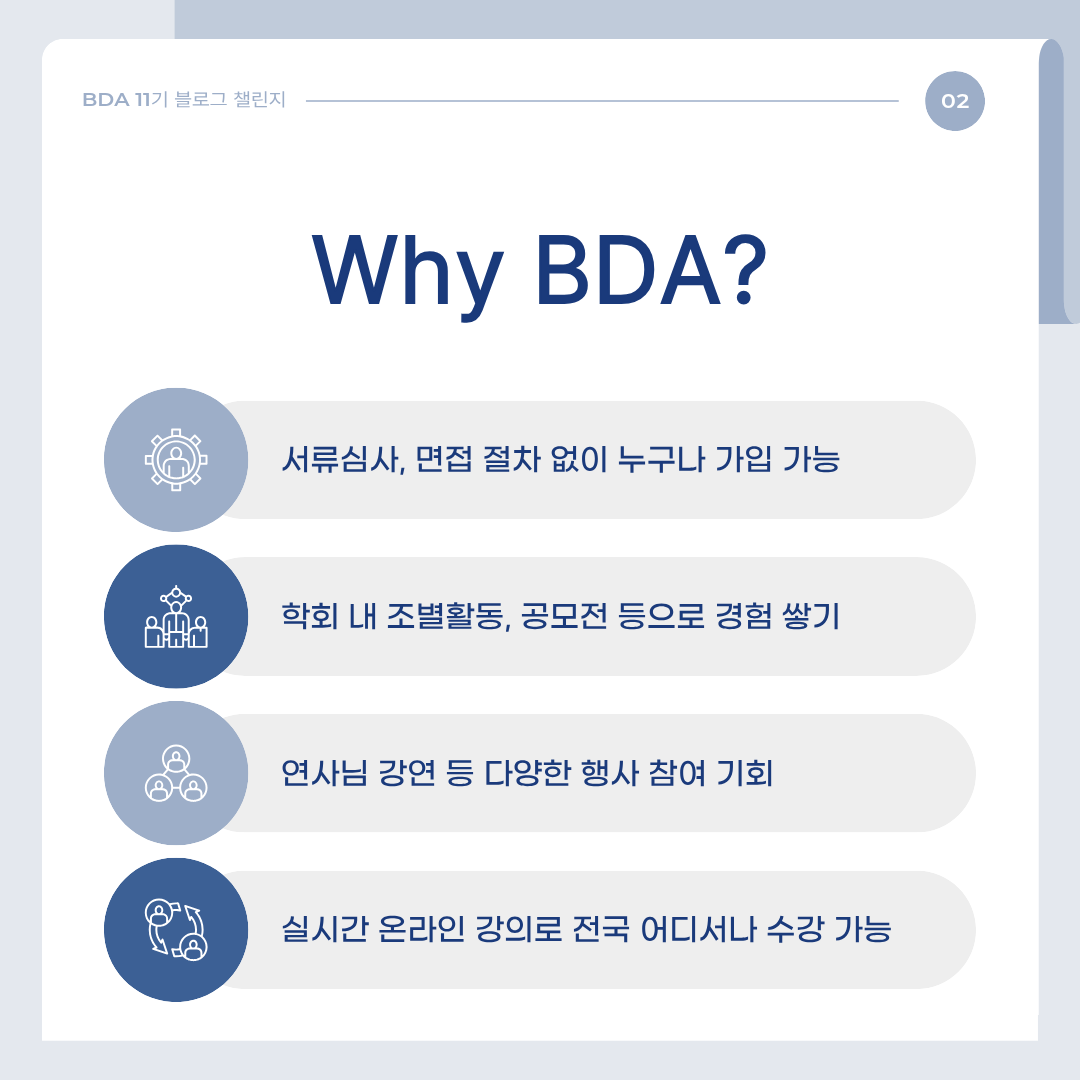 이러한 연유로 BDA 11기 정규학회원으로 참여하게 되었습니다.